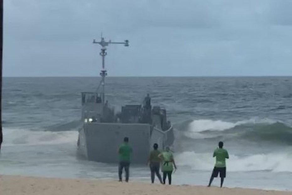 Embarcação da Marinha chama a atenção de banhistas ao se aproximar da Praia da Macumba; vídeo